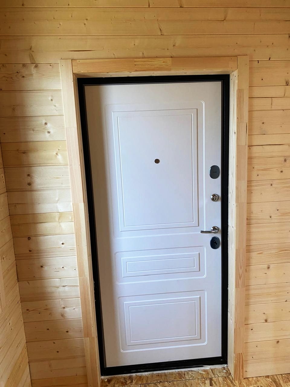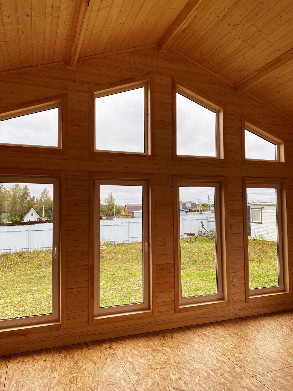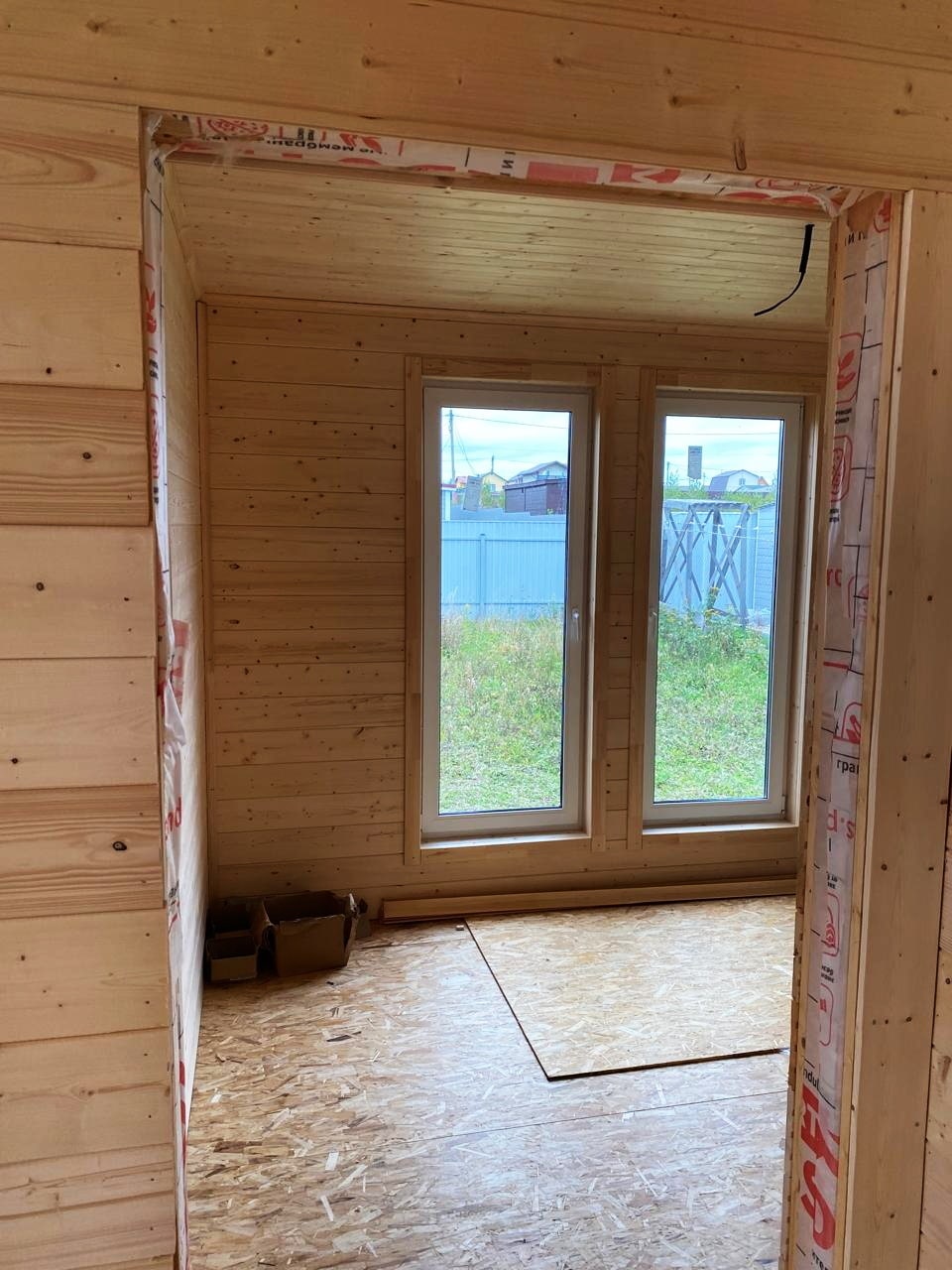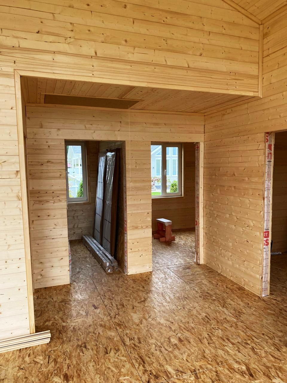 Внешняя отделка дома - виниловый сайдинг, внутренняя облицовка - вагонка "Штиль" сорта АБ камерной сушки, на полу сделана подготовка из ОСП плиты 22 мм для укладки напольного покрытия, на которые уже укладывают ламинат или линолеум. Внутренние двери Эко-шпон (производство Россия). Входная дверь железная с терморазрывом (производство Россия). Ничего подгонять при ремонте не потребуется, так как при строительстве каркасных домов обеспечивается идеальная геометрия поверхностей и стыковка углов.