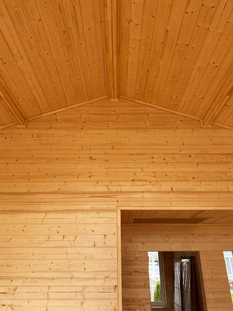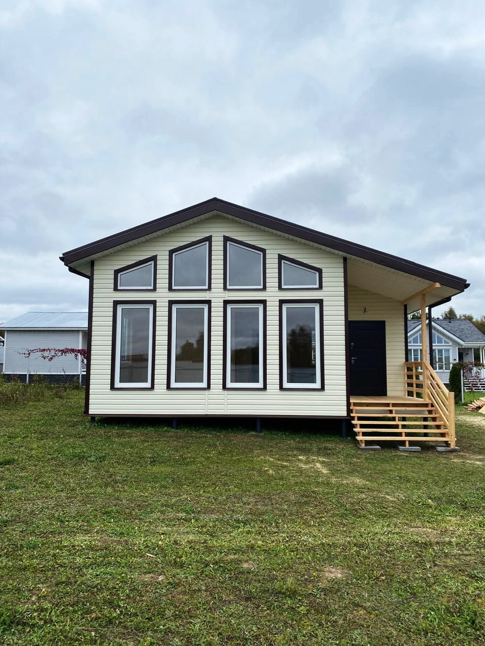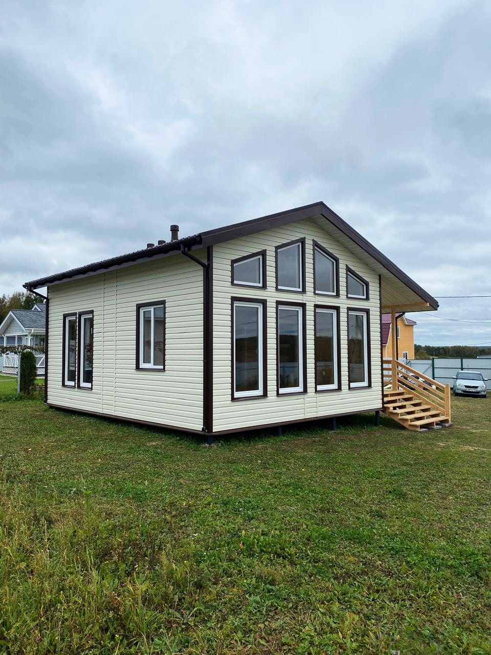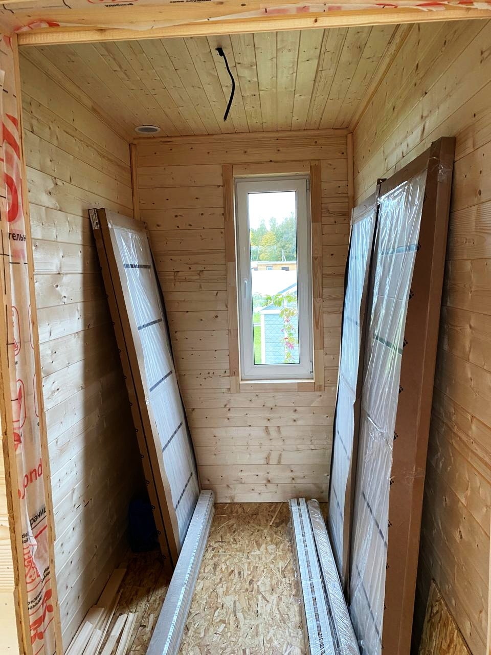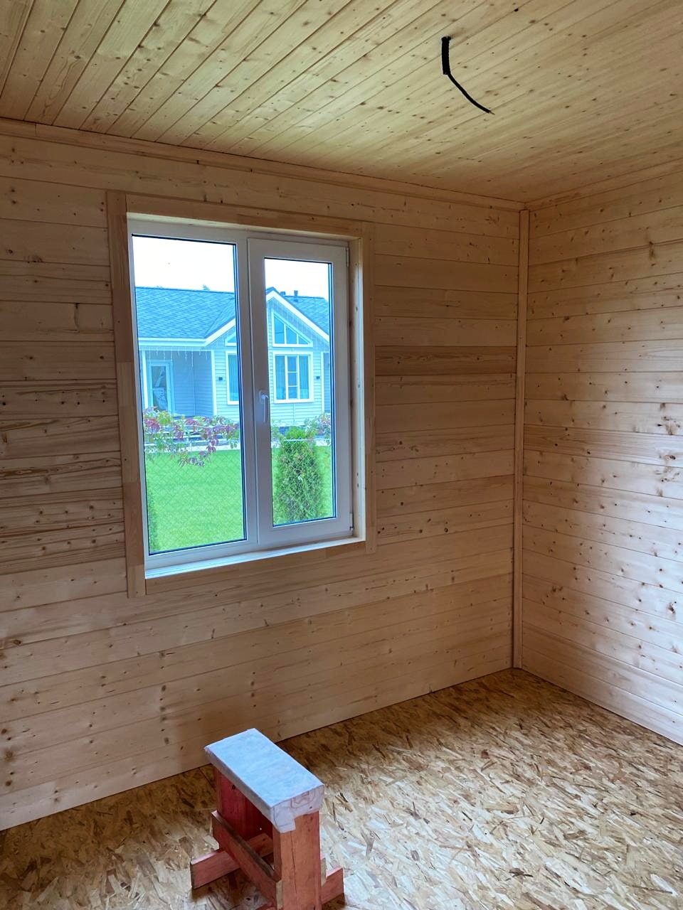 Внешняя отделка дома - виниловый сайдинг, внутренняя облицовка - вагонка "Штиль" сорта АБ камерной сушки, на полу сделана подготовка из ОСП плиты 22 мм для укладки напольного покрытия, на которые уже укладывают ламинат или линолеум. Внутренние двери Эко-шпон (производство Россия). Входная дверь железная с терморазрывом (производство Россия). Ничего подгонять при ремонте не потребуется, так как при строительстве каркасных домов обеспечивается идеальная геометрия поверхностей и стыковка углов.