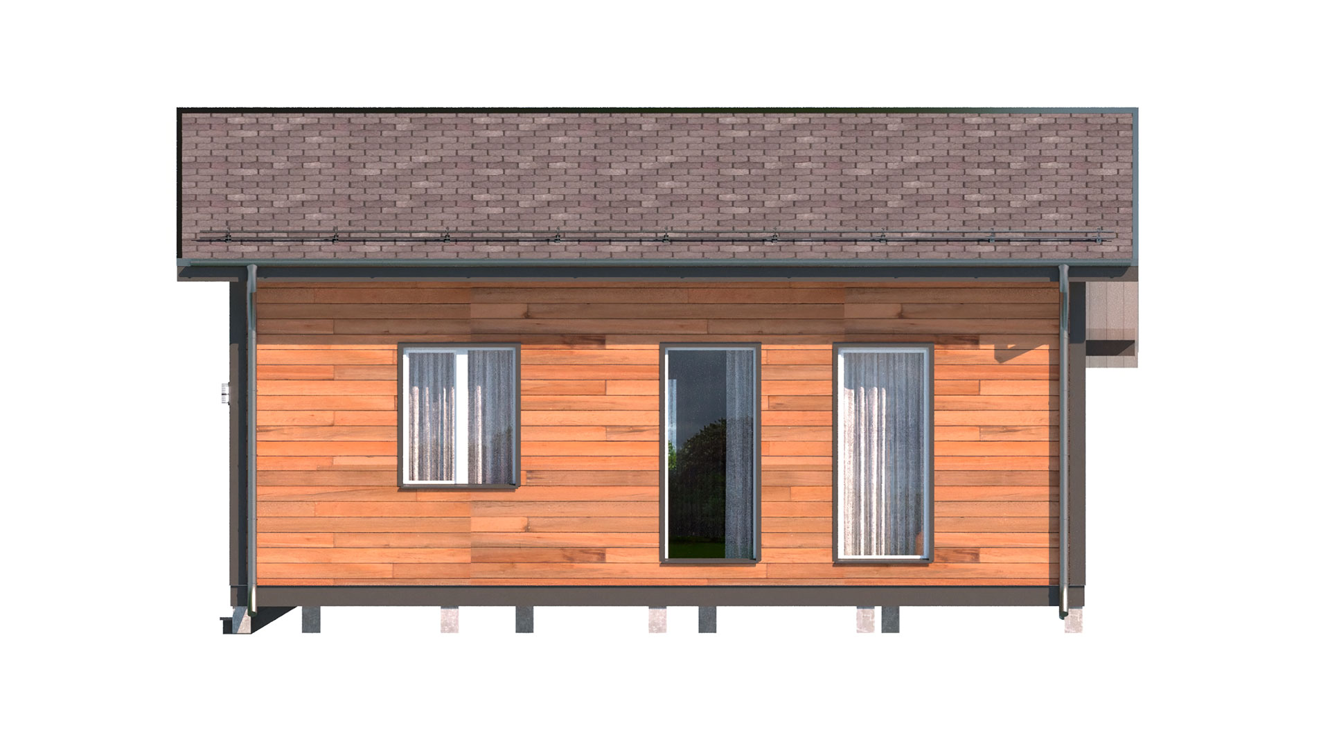 Каркасный дом "Сказка" с асимметричной скатной крышей и застекленным фасадом станет комфортным жилищем для небольшой семьи. Все помещения в доме светлые и просторные. Согласно проектной планировке, в коттедже находятся кухня-гостиная и отдельная комната, большая ванная, санузел, а также тамбур с выходом на террасу. Возможен и другой вариант зонирования жилого пространства, при котором вместо ванной предусмотрена ещё одна комната.